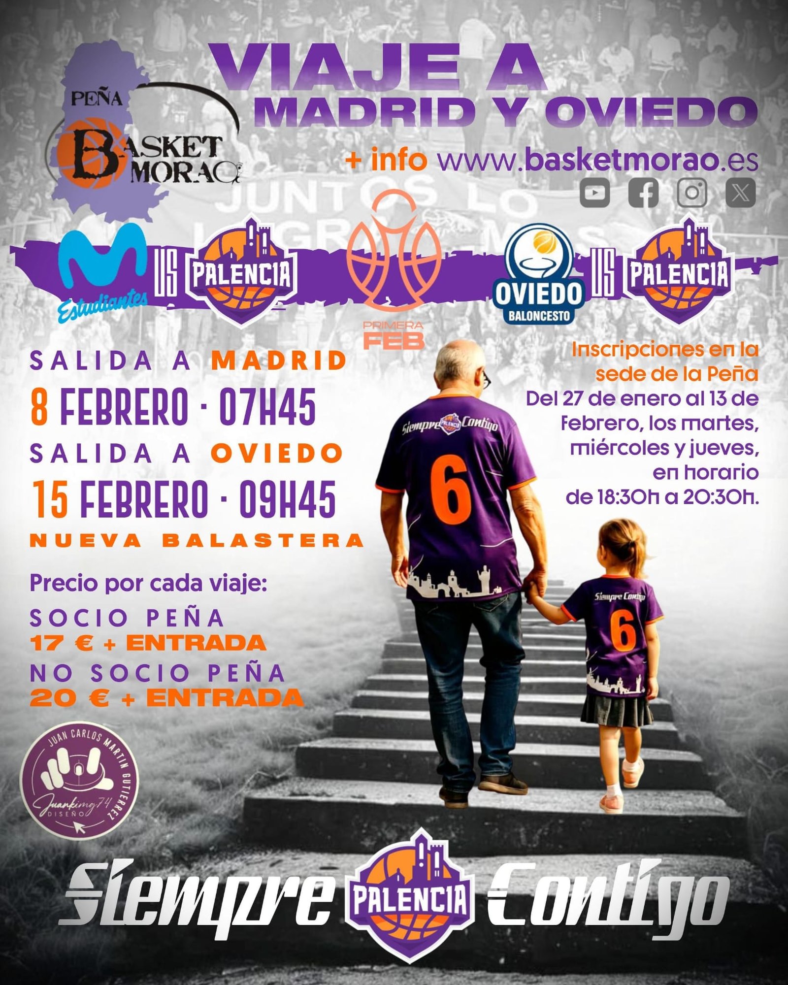 El periodo de inscripción presencial para todos los aficionados palentinos que deseen realizar ambos viajes, será del 27 de Enero al 13 de Febrero, los martes, miércoles y jueves, en horario de 18:30 h. a 20:30 h., en la sede de la Peña BASKET MORAO, sita en la Avenida de Santander Nº2, Bajo.